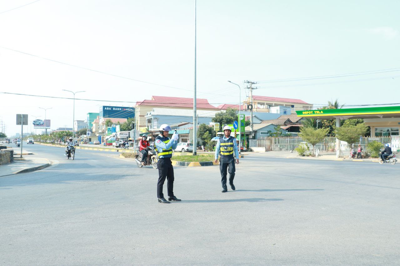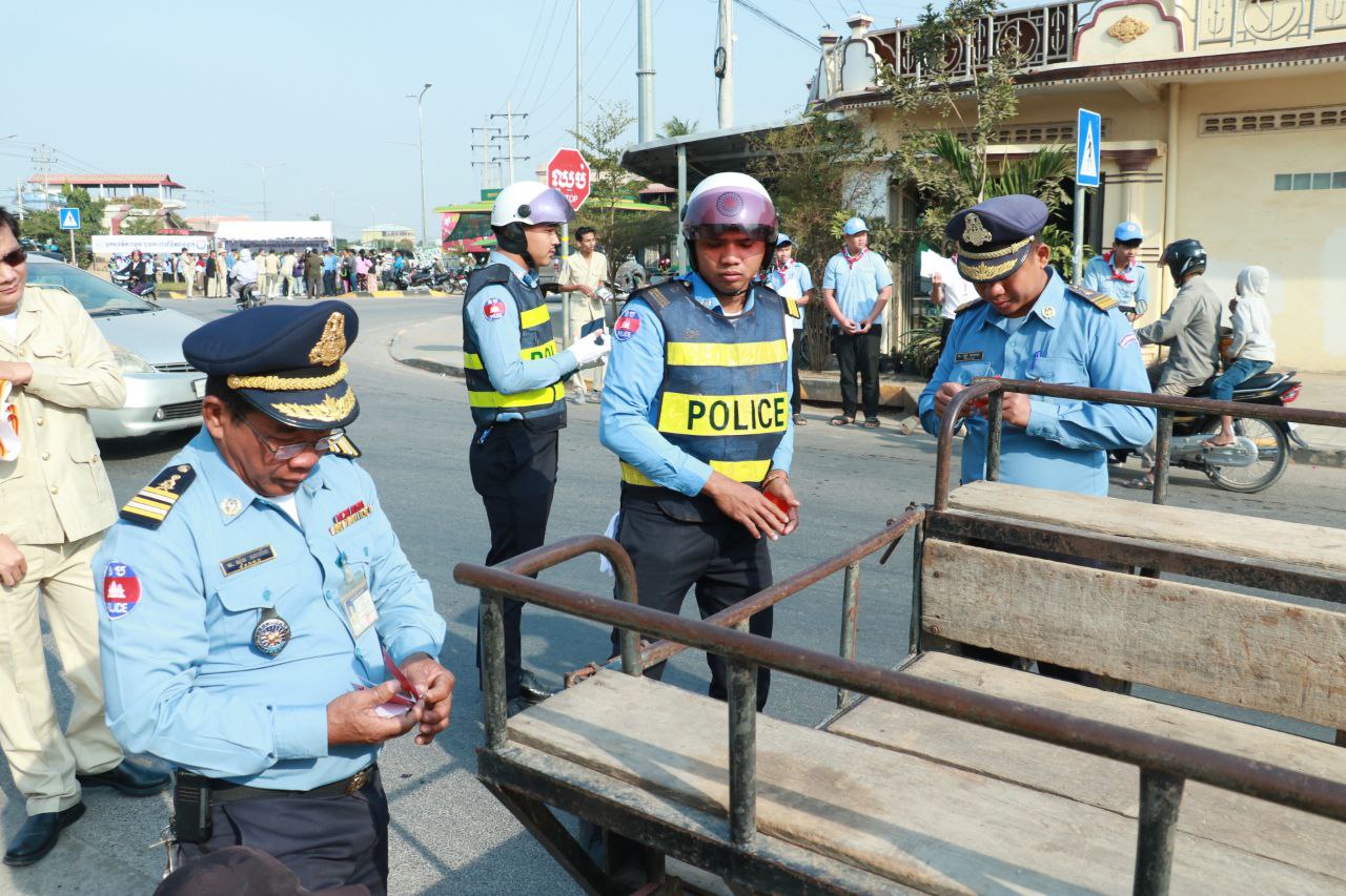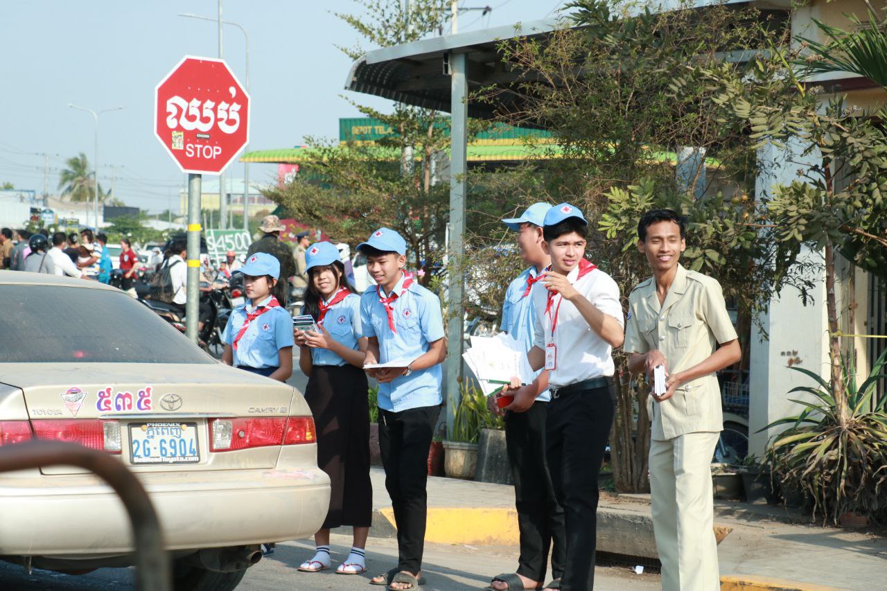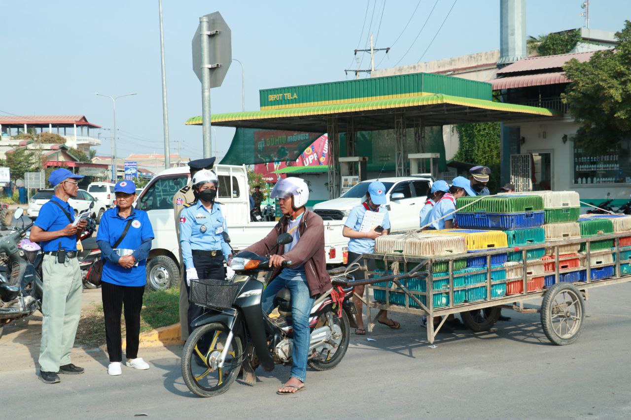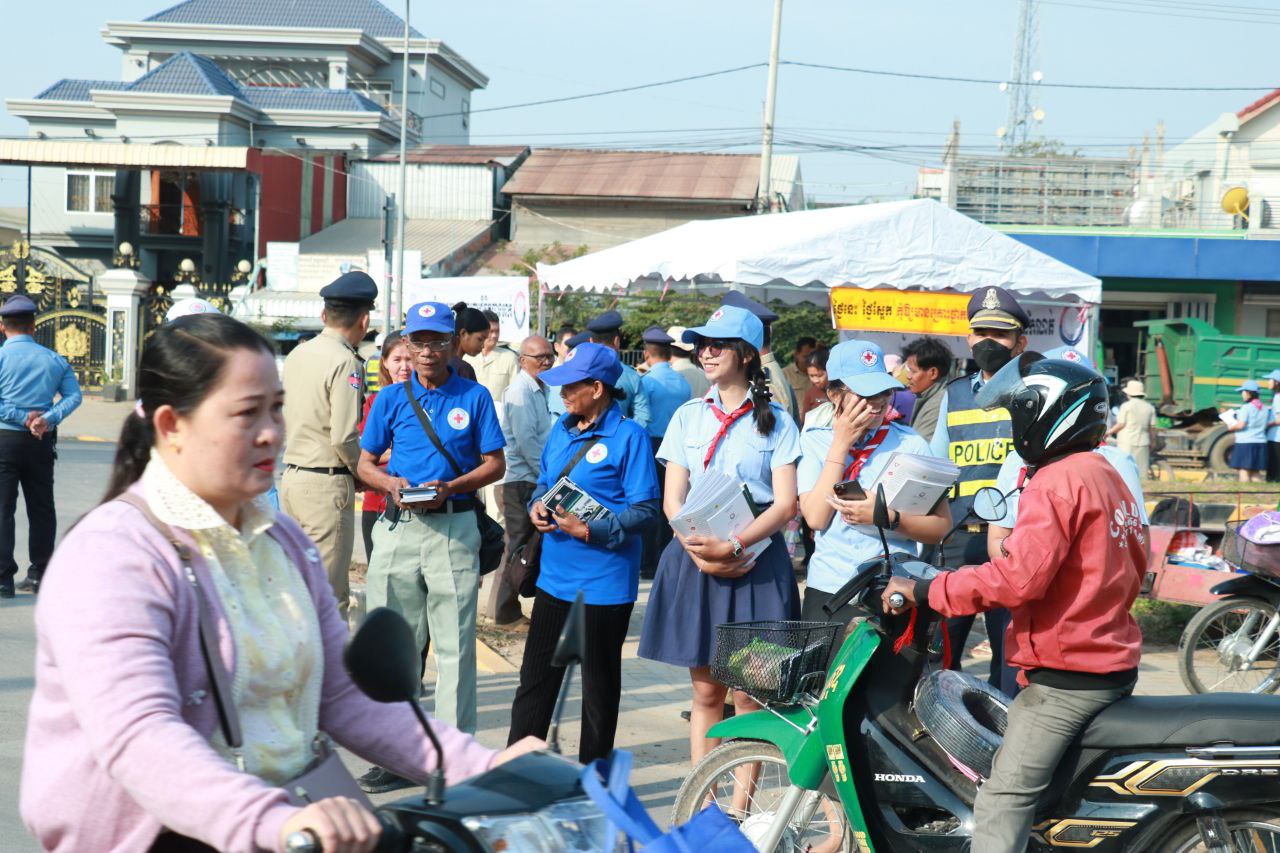 មន្ត្រីជំនាញចរាច​រណ៍ផ្លូវគោក ចុះអប់រំផ្សព្វផ្សាយសុវត្ថិភា​ពចរាចរណ៍ផ្លូវគោក នៅចំណុចរង្វង់​មូល​យាយ​ច្រូតស្រូវ ក្នុងឃុំឫស្សីក្រោក ស្រុកមង្គលបូរី